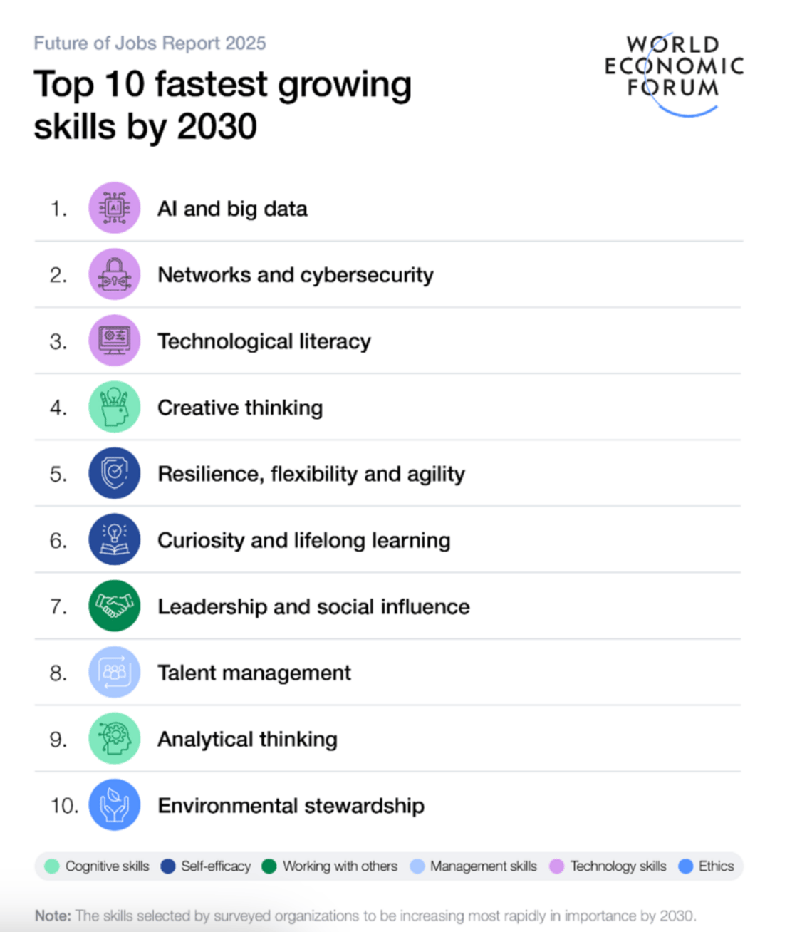 Meanwhile, AI-related skills demand is up ~70% YoY, and the fastest-growing skills now include AI literacy, communication, and decision-making.